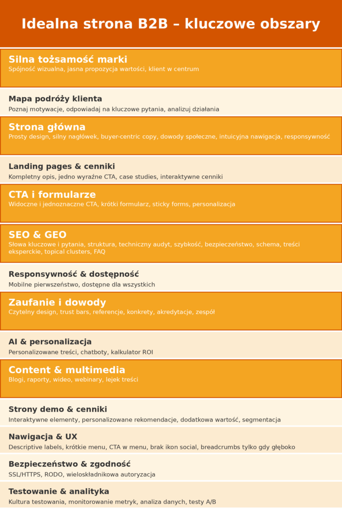 - Responsywność – ponad 50 % zapytań B2B odbywa się na urządzeniach mobilnych. Strona musi szybko dostosowywać się do różnych ekranów; formularze muszą być krótkie i łatwe do wypełnienia na telefonie.